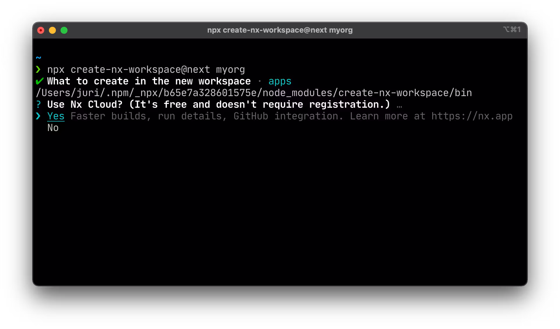 When you set up a new Nx workspace with create-nx-workspace the question about opting into Nx Cloud will be pointed on "Yes" by default now.