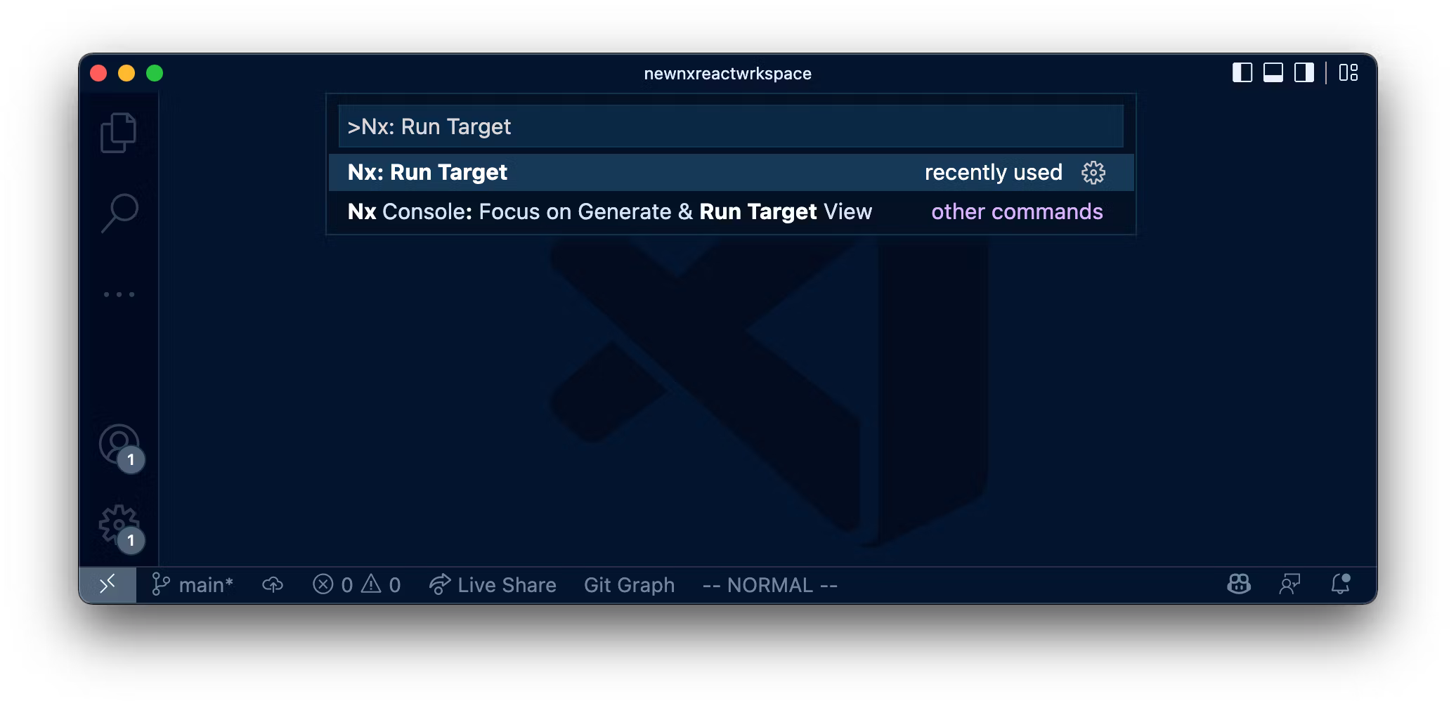 You can now open the VSCode Command menu (Cmd + Shift + P or Win + Shift + P) and enter "Nx: Run Target" to invoke the Run Target menu which allows to choose the target to run as well as the project to execute the target on.